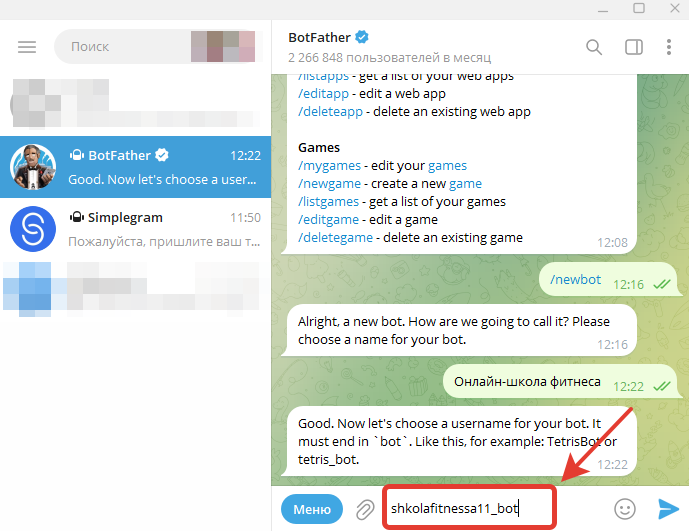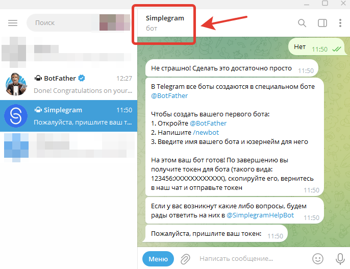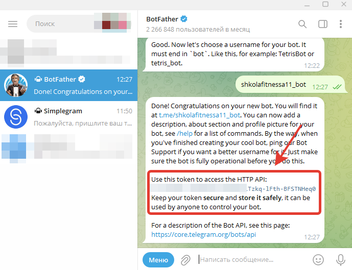 Копируем токен и переходим обратно в диалог с ботом Simplegram