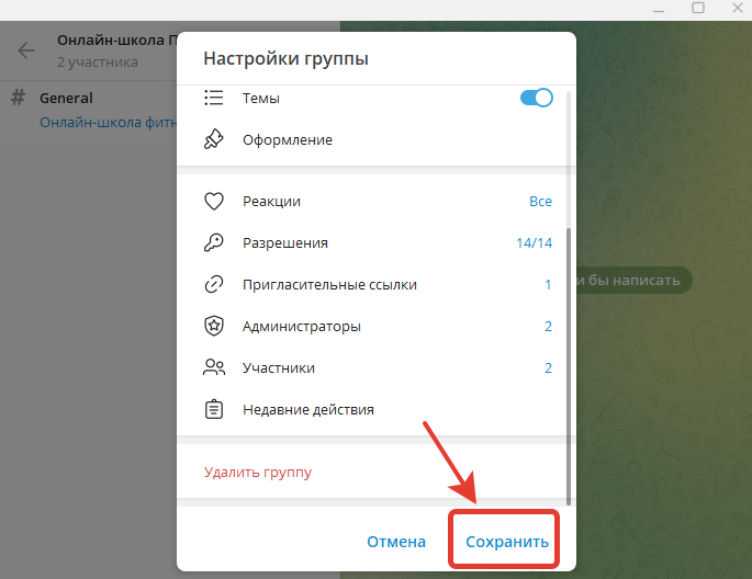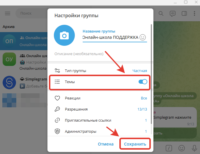 Таким образом, включили раздел Темы в группе Telegram