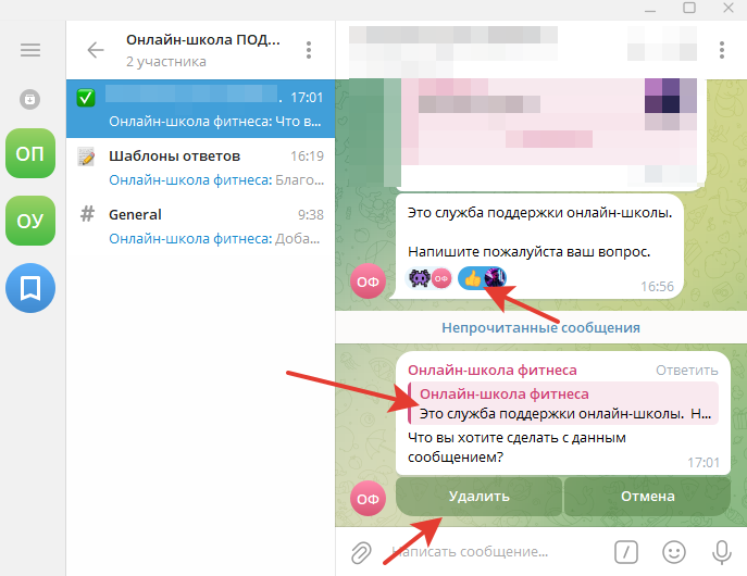 Таким образом это сообщение удалится в чате диалога с клиентом