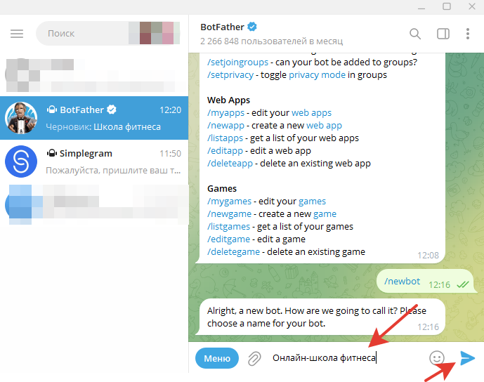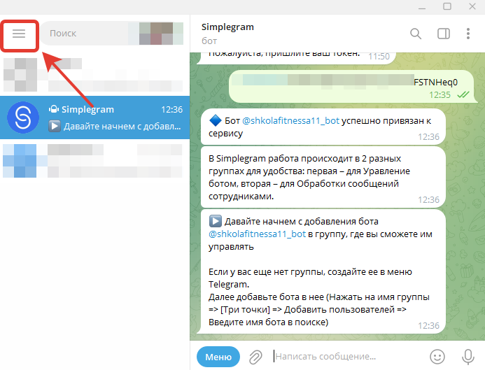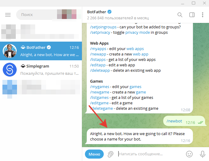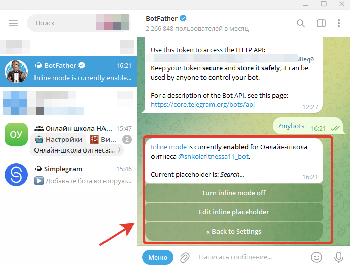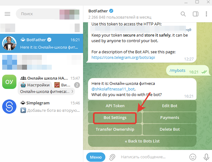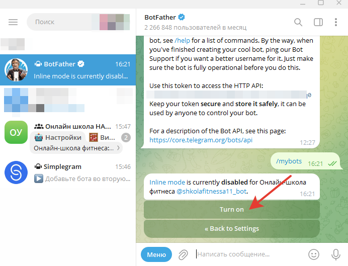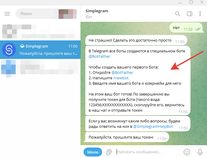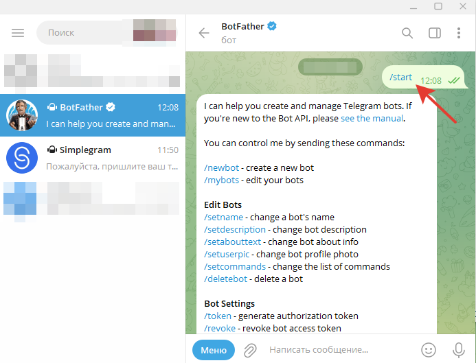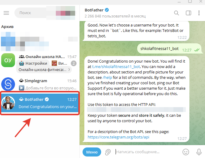 Копируем токен и переходим обратно в диалог с ботом Simplegram
