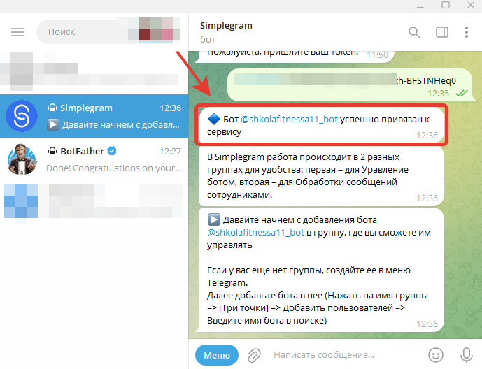 После этого бот успешно будет привязан к Simplegram
