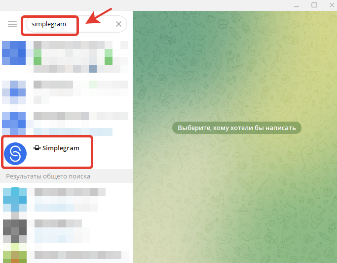 - Переходим в приложение Telegram и вводим в поисковой строке название бота Simplegram или переходим по ссылке https://t.me/SimplegramMainBot в диалог с ботом