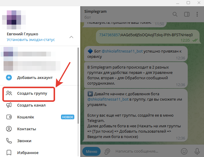 Теперь необходимо создать группу в Telegram.