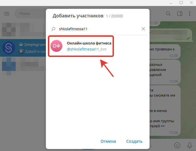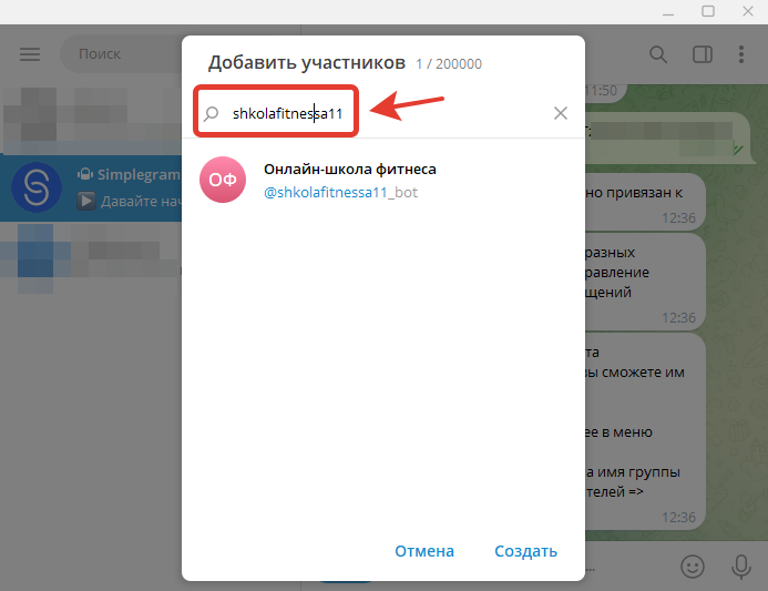- Вводим в поисковую строку полное название своего бота, нажимаем на своего бота в найденном списке и нажимаем кнопку Создать