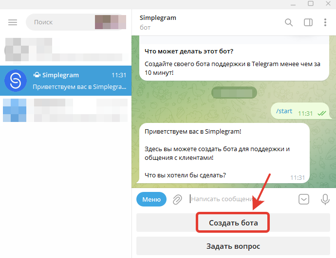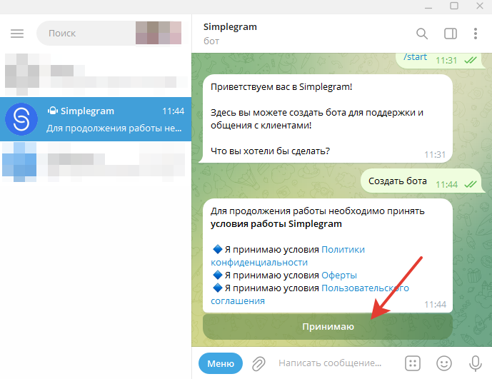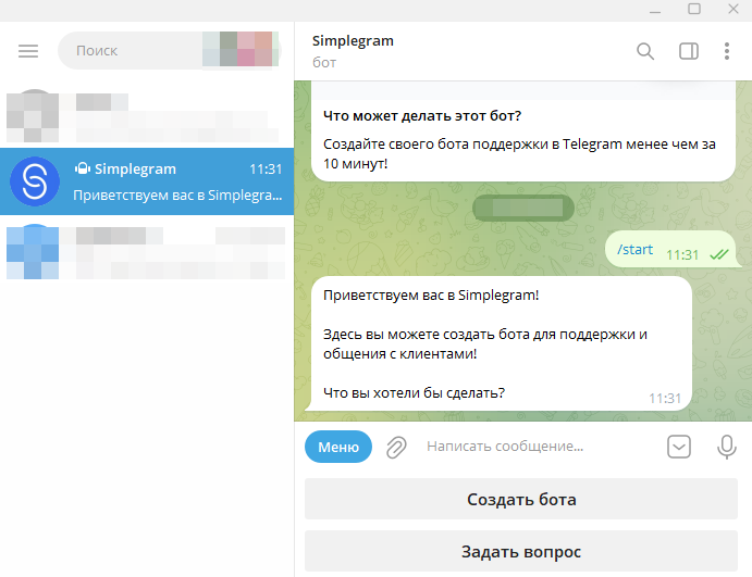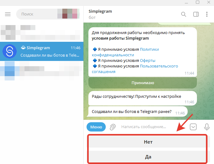 Для начала работы необходимо перейти в диалог с ботом Simplegram и выполнить первоначальные настройки.