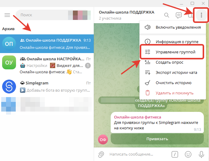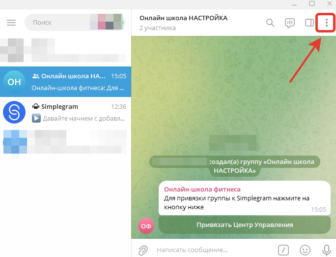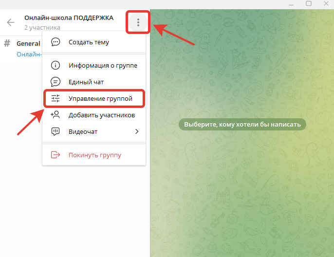 - Переходим в управление группой, нажимаем на три точки
