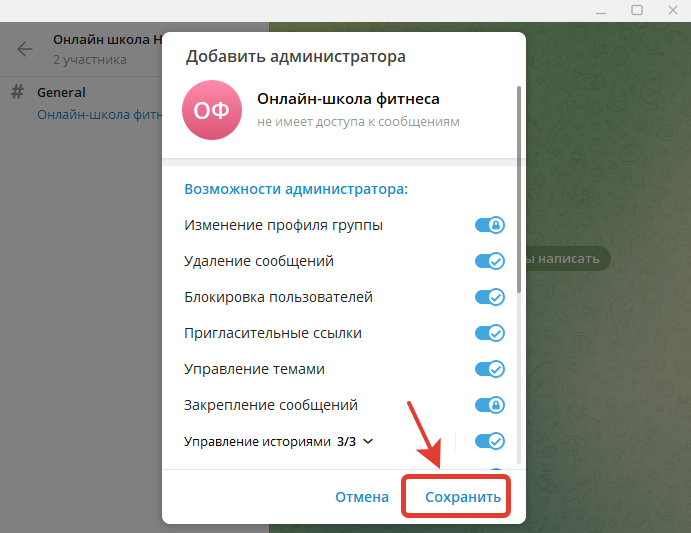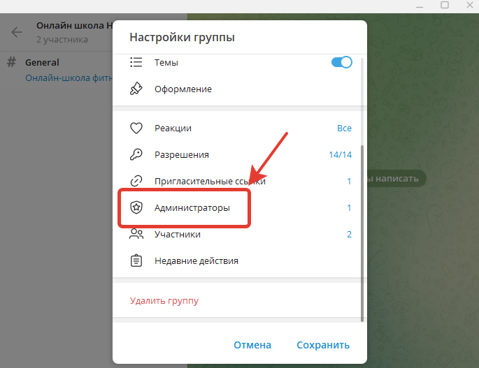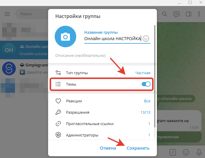 Таким образом, включили раздел Темы в группе Telegram