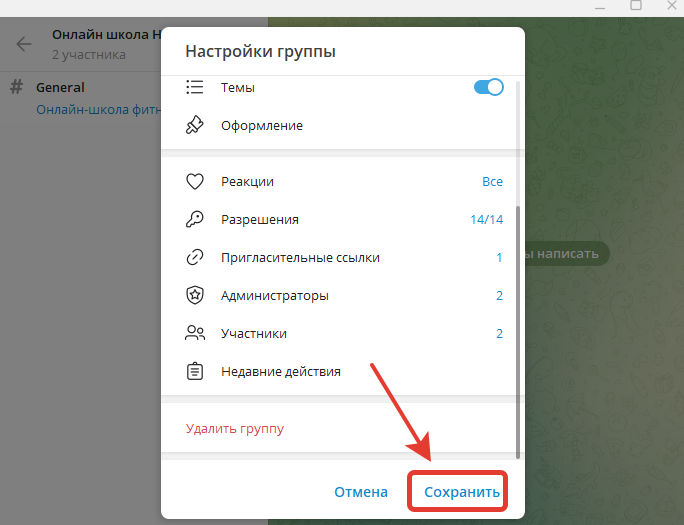 - Включить в новом меню управления группой раздел Темы и сохранить изменения