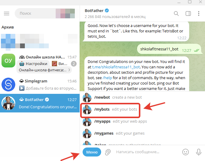 - Нажимаем на кнопку меню и выбираем команду /mybots