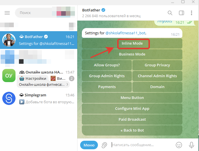 Шаг 8. Включение опции Inline Mode в боте