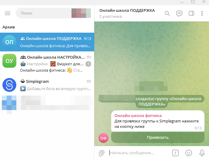 Теперь необходимо выполнить привязку своего бота в Telegram к боту Simplegram.