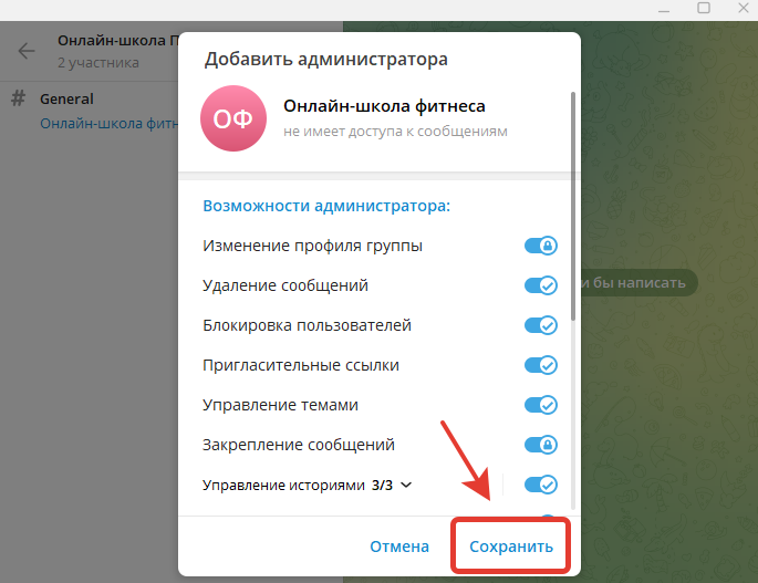 Далее, нужно будет добавить бота в роли администратора в эту группу.